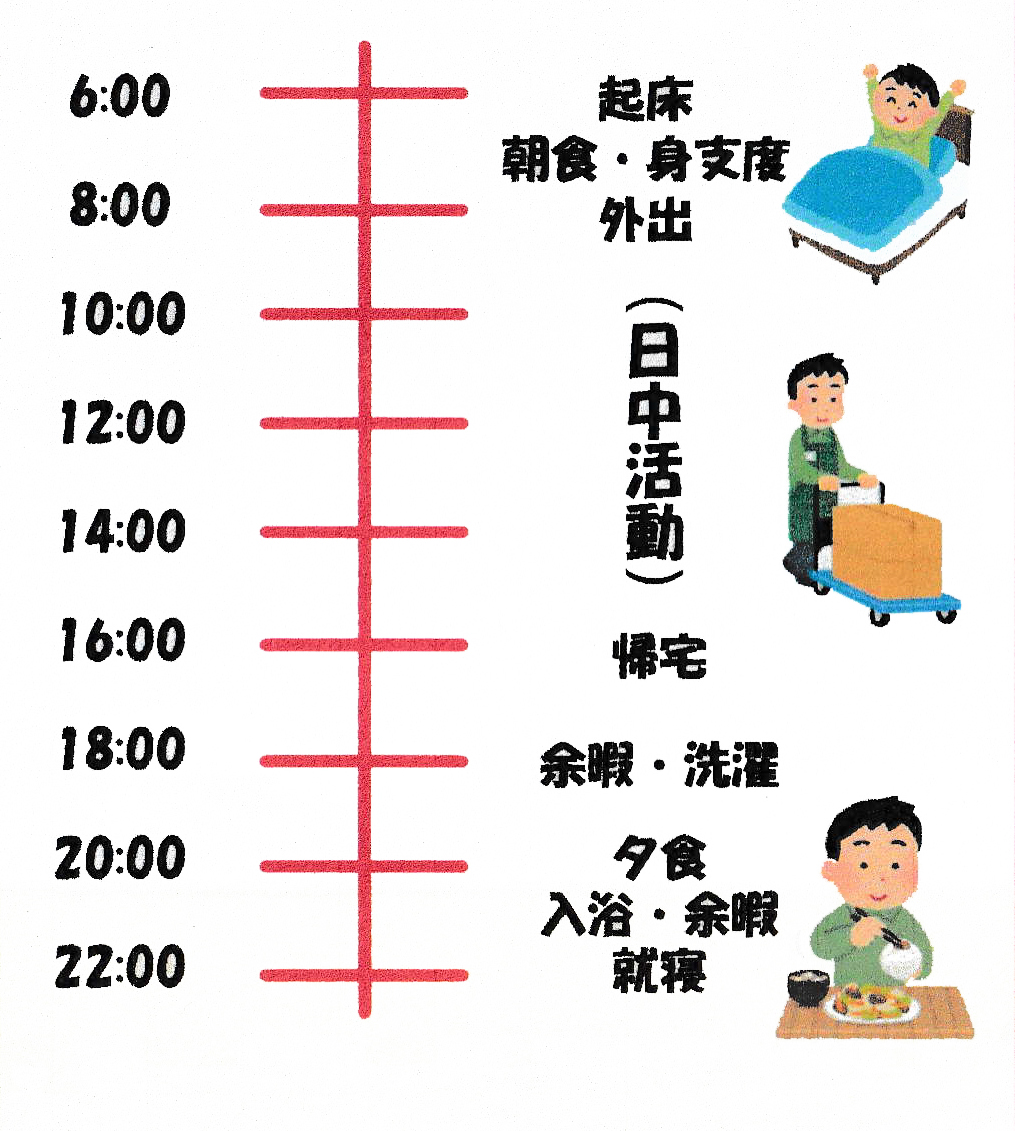 - 門限はありますが基本的に自由です。近所のコ ンビニに行ったり、週末は外泊や旅行に出かけ る方もいます。ご本人の状態によっては難しい 方もいらっしゃいますのでご相談ください。